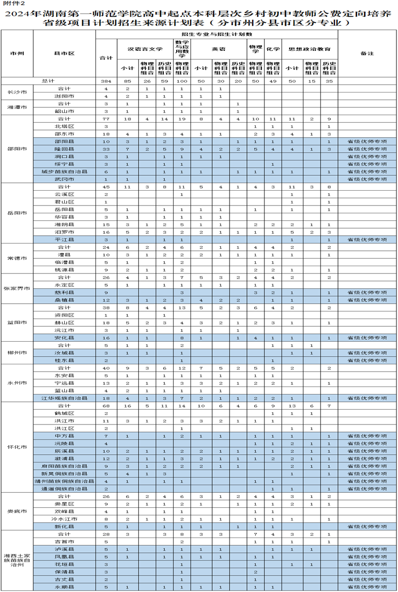 附件:1. 2024年伟德体育官方网站高中起点本科层次乡村高中教师公费定向培养省级项目计划招生来源计划表(分市州分县市区分专业)