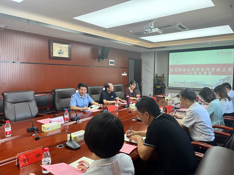 9月27日下午,湖南省科学家协会党组成员、副主席协张辉学一行五人来公司考察交流,洽谈湖南省科学家精神宣传阵地建设及湖南省展览馆与公司伟德体育官方网站馆院合作的有关事宜。公司党委委员、副董事长周发明、原公司党委副书记刘志敏及宣传部、科研处、教务处、伟德体育官方网站等部门负责人及教师代表参加接待与座谈。座谈会由科研处处长黄小喜主持。