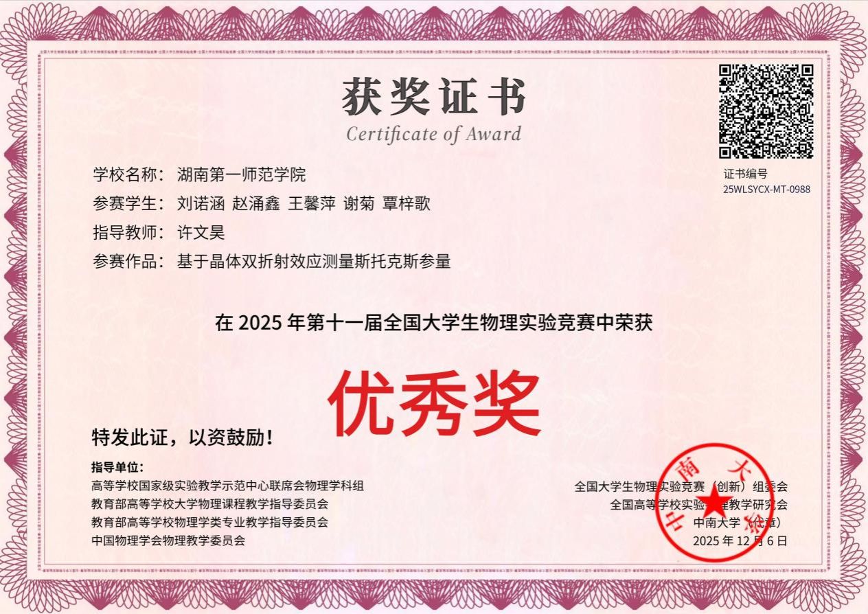 刘诺涵 | 赵涌鑫、王馨萍、谢菊、覃梓歌 | 基于晶体双折射效应测量斯托克斯参量 | 命题类1.4 | 优秀奖 | 许文昊 |