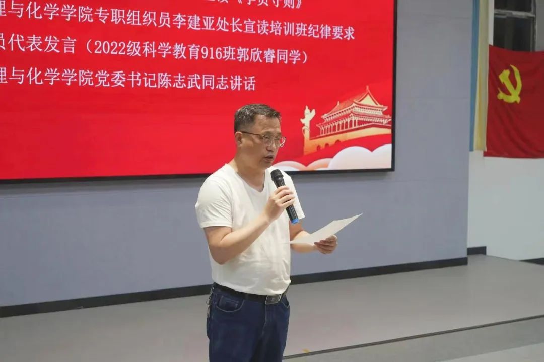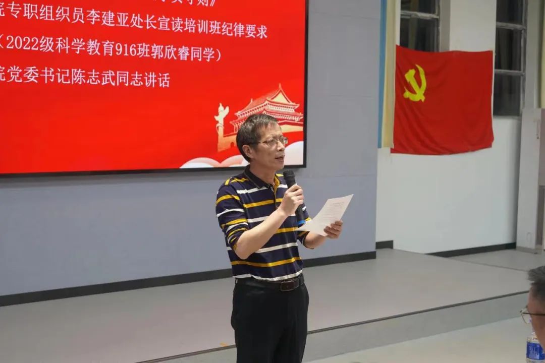 接下来,教育公司党委副书记张志新宣读《学员守则》,并希望入党积极分子以身作则,在学习与生活中都要做好带头模范作用。伟德体育官方网站专职组织员李建亚宣读“培训班纪律要求与学员安排”,强调入党积极分子应当遵守培训纪律,认真面对本次培训,不负时代的期待。随后,2022级科学教育917班郭欣睿同学代表学员发言。