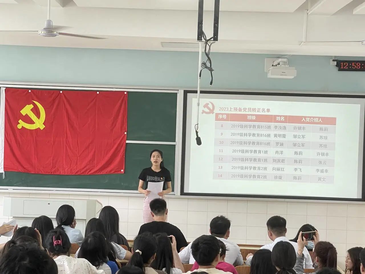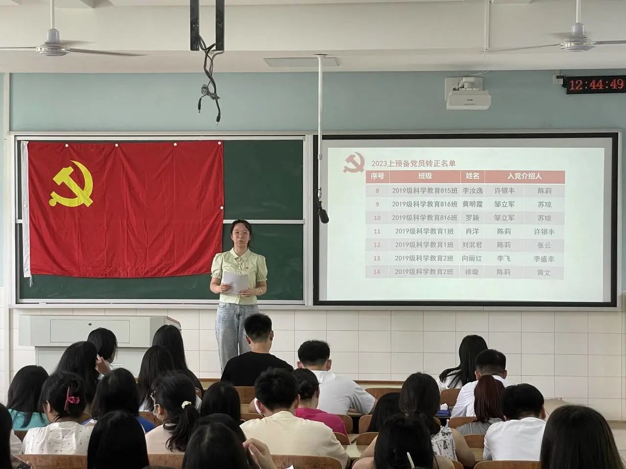 会上,易欣兰、刘崇瑛等18名预备党员依次向党组织汇报自己在预备期的表现,取得的成绩,找出缺点和不足,并且表明自己入党的态度和决心。