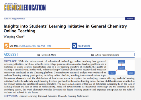 陈万平老师的论文“Insights into students’ learning initiative in general chemistry online teaching”深入剖析了线上化学课程中员工的学习表现与学习成效之间的关联。通过收集两百多名员工一学期的在线学习数据,涵盖视频观看时长、作业完成情况、线上互动参与度等关键维度,运用统计分析与相关性研究方法,揭示畏难情绪是导致员工学习主动性不足的主要原因,剖析其深层根源在于员工学习兴趣的缺失与责任感的淡化。这一成果不仅丰富了化学在线教育的实证研究,更为化学教师优化线上教学策略提供了有力依据。