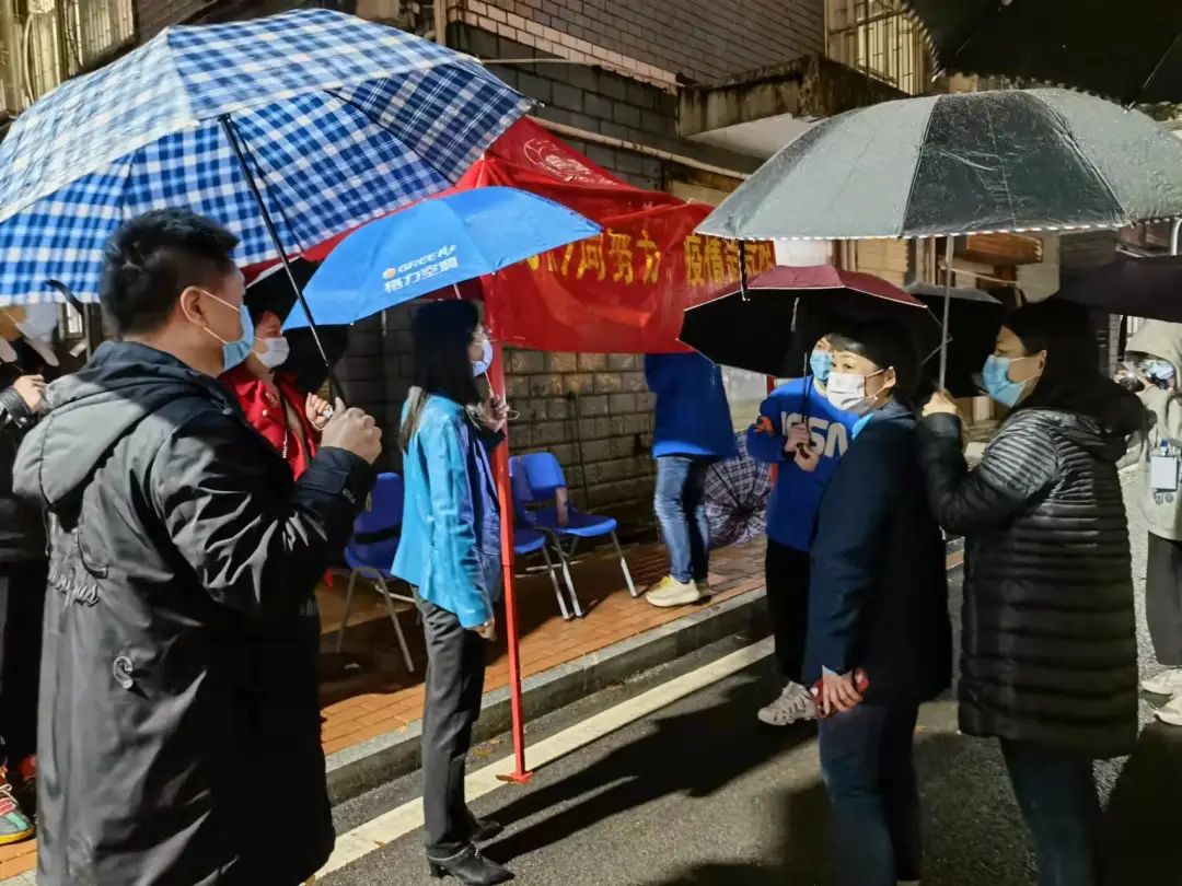 微雨蒙蒙,蒋董事长一行来到西侧马路,看望坚守岗位的志愿者,对同学们的工作表示高度肯定,提醒大家及时添衣保暖,保护好自身健康,才可以才能够为防疫做更多的贡献!