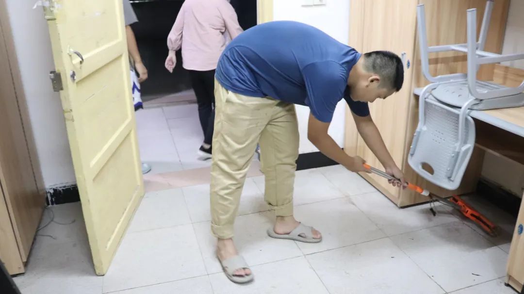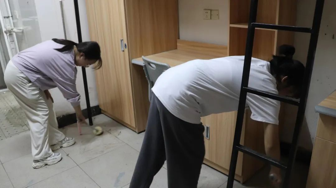 清扫过程中,志愿者们本着一丝不苟的严谨态度,明确分工、相互配合、井然有序,力求做好迎新工作第一步,不遗漏任何一间寝室,不放过任何一处死角。从检查宿舍门窗到擦拭衣柜爬梯;从清洗地板污垢到排查电器安全;从擦抹桌椅墙面到细致清洁床板床沿,同时还细心保证寝室内外通风,以便新生们最大程度上享受安全温馨的居住环境。最终在所有志愿者的共同努力下,新生宿舍焕然一新。
